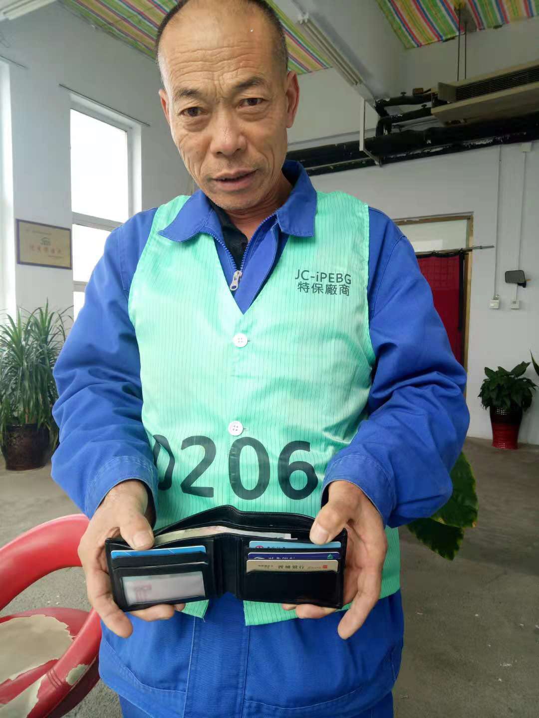 2018年10月16日,我公司員工賈聯(lián)化在富士康清潔時(shí)發(fā)現(xiàn)一個(gè)男士錢包,里面有加油卡、銀行卡以及一些現(xiàn)金,賈師傅連忙通知了部門主管,請(qǐng)她幫忙聯(lián)系失主。