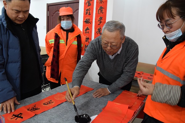 現(xiàn)場人頭攢動(dòng),熱鬧非凡,處處洋溢著歡樂喜慶的氣氛。賈大一老師剛執(zhí)墨筆,就吸引了現(xiàn)場數(shù)十名員工駐足觀賞。他的書法如行云流水,一副寓意著對(duì)新年美好祝福的春聯(lián)便一氣呵成。各位老師揮毫潑墨,一幅幅散發(fā)著清新墨香的春聯(lián)展現(xiàn)在大家面前。“梅花獎(jiǎng)”獲得者張保平老師現(xiàn)場演唱上黨梆子戲曲名段,字正腔圓,渾厚豪邁,把活動(dòng)推向了高潮。市總工會(huì)副主席韓敦峰為員工分發(fā)了對(duì)聯(lián)和防疫口罩。