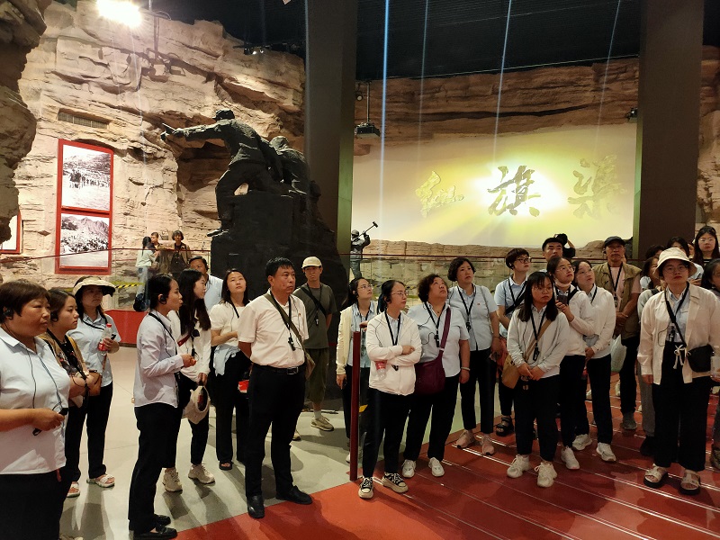 走進紅旗渠紀念館,大家跟隨講解員的腳步,在千年旱魔,世代抗爭;紅旗引領(lǐng),創(chuàng)造奇跡;英雄人民,太行豐碑;山河巨變,實現(xiàn)夢想;繼往開來,精神永恒五個部分逐一駐足學(xué)習(xí),通過一件件珍貴的物品,一幅幅生動的圖片、一幀幀震撼的畫面、一個個感人的故事,讓大家身臨其境感受到林州人民建造人工天河時不畏艱險,頑強拼搏,緊靠一錘一鏟削平1250座山頭、鑿?fù)?11個隧道、架設(shè)151個渡槽的恢弘場景。在場的各位都深深地被“自力更生、艱苦創(chuàng)業(yè)、團結(jié)協(xié)作、無私奉獻”的紅旗渠精神所感動,切實感受到中華民族勤勞堅韌的優(yōu)良傳統(tǒng),領(lǐng)悟社會主義是干出來的,新時代是奮斗出來的。