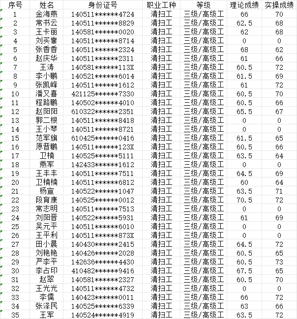 晉城市潔霸清潔服務股份有限公司職業(yè)技能等級認定中心2024年7月14日第7批保潔員高級認定人員成績公示