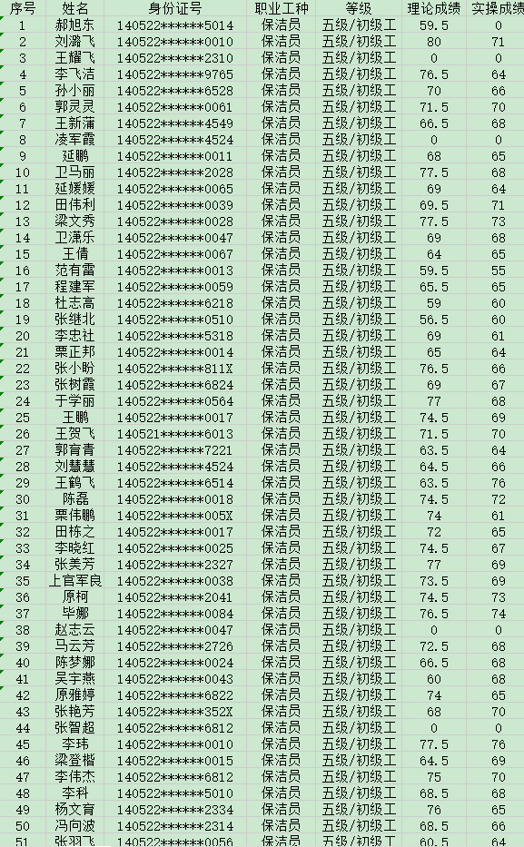 晉城市潔霸清潔服務(wù)股份有限公司職業(yè)技能等級認(rèn)定中心2024年8月17日第29批保潔員初級認(rèn)定人員成績公示