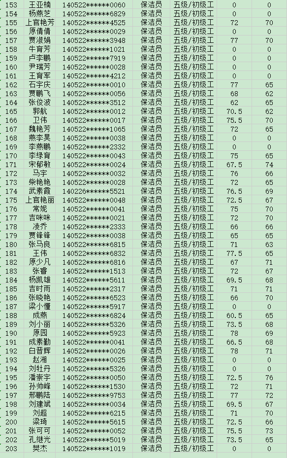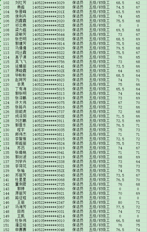 晉城市潔霸清潔服務(wù)股份有限公司職業(yè)技能等級認(rèn)定中心現(xiàn)將20248月17日認(rèn)定人員成績公示如下: